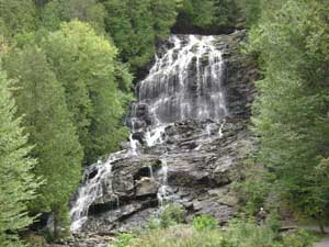 Beaver Brook Falls are some of the farthest away from the inn, located near the Canadian border and the Northeast Kingdom of Vermont, but are easily viewed without a hike. The falls are about 70 feet tall, dropping over a jagged ledge of the Waits River Formation, a large dark quartzite. They can be viewed from a wayside picnic area about 2.5 miles east of Colebrook, NH.